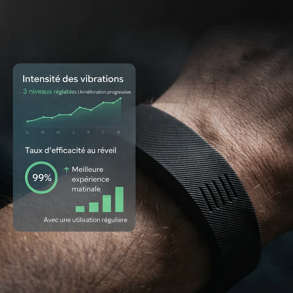Contrairement aux réveils classiques, KOVA utilise une vibration ciblée pour vous réveiller efficacement sans bruit ni stress. Une solution simple, discrète et fiable pour commencer la journée.