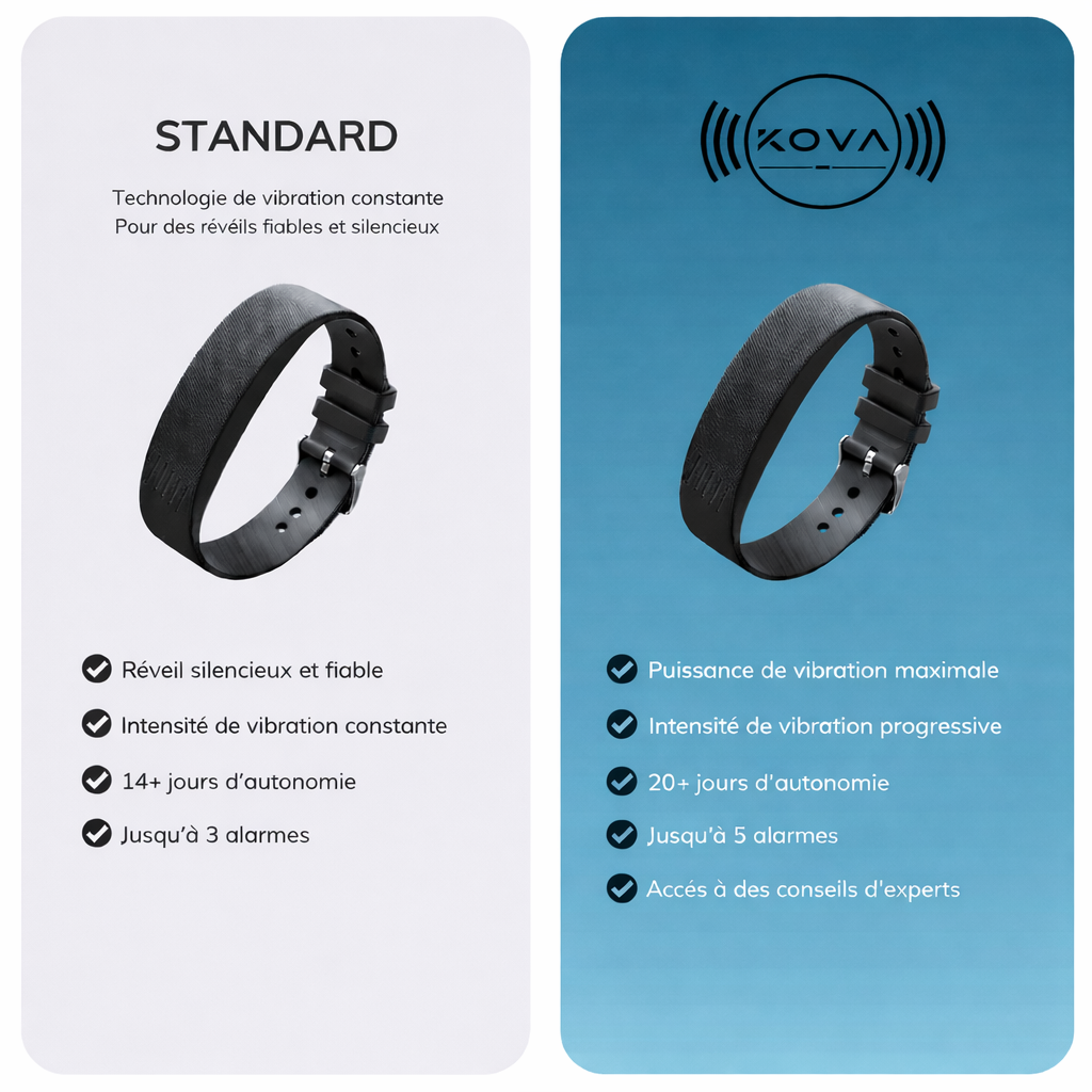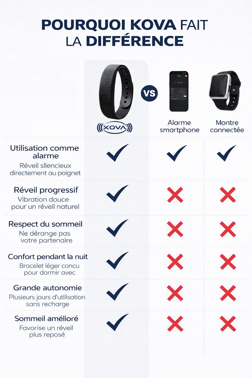 Le réveil KOVA utilise une vibration silencieuse directement au poignet pour vous réveiller efficacement, sans alarme sonore et sans déranger votre partenaire. C’est la solution idéale pour les couples, les dormeurs profonds et ceux qui veulent un réveil plus naturel et moins stressant.